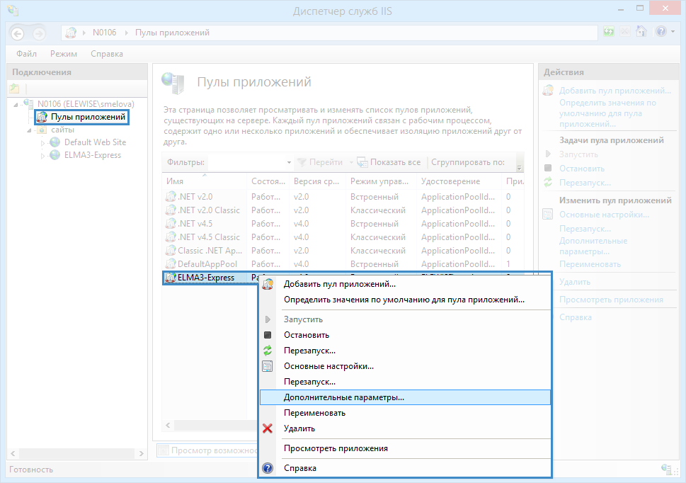 Рис. 2. Окно "Диспетчер служб IIS". Раздел "Пулы приложений". Контекстное меню сервера ELMA. Пункт "Дополнительные параметры"
