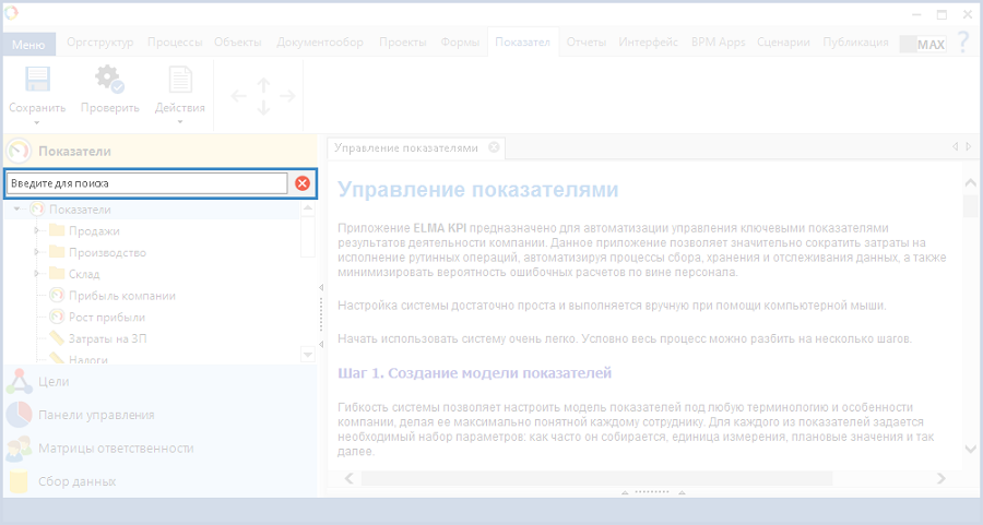 Доработки осуществляются в Дизайнере ELMA на вкладке Показатели, данная вкладка доступна при наличии активированного приложения ELMA KPI.