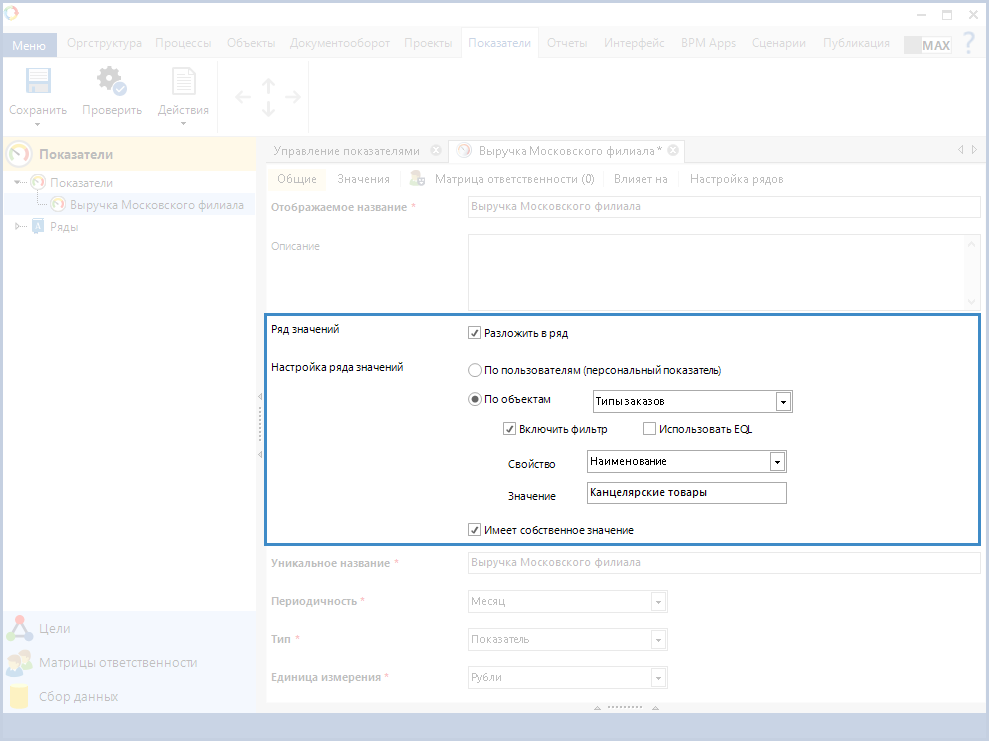 Рис. 2. Карточка показателя. Вкладка "Общие". Блок "Настройка ряда значений"