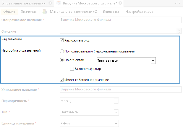 Рис. 2. Карточка показателя. Вкладка "Общие". Блок "Настройка ряда значений"