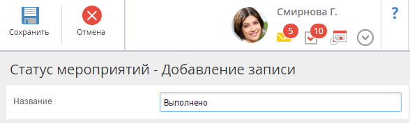 Страница содержит поле Название, в котором необходимо ввести наименование создаваемого статуса мероприятий для его отображения в веб-приложении.