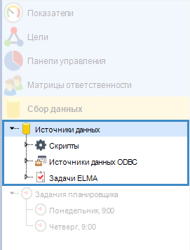 Источниками данных для сбора значений показателей в системе ELMA могут быть: скрипты, Задачи ELMA, источники данных ODBC (рис. 1).