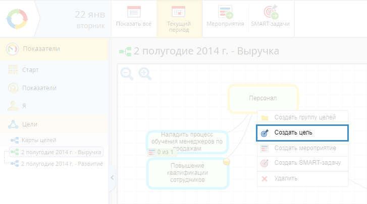 Рис. 1. Карта целей, доступная для редактирования только в веб-приложении. Контекстное меню карты целей. Пункт "Создать цель"