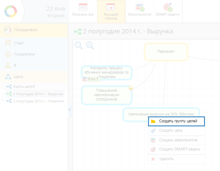 Рис. 5. Карта целей, доступная для редактирования только в веб-приложении. Контекстное меню карты целей. Пункт "Создать группу целей"