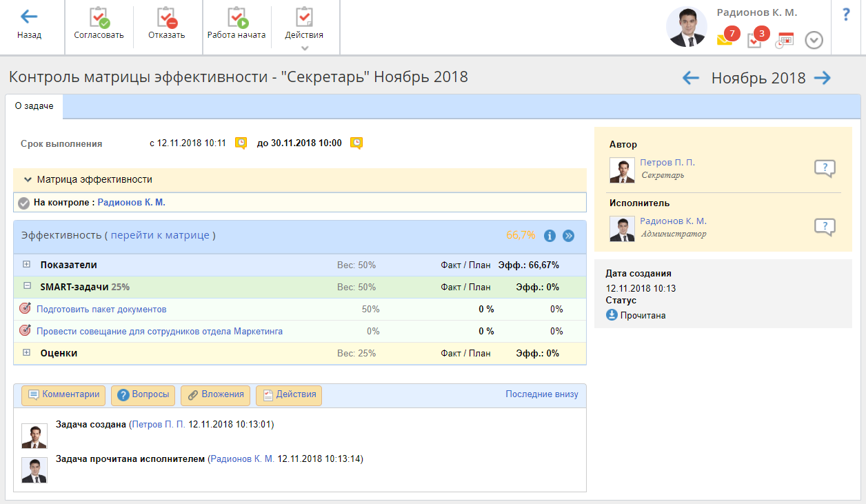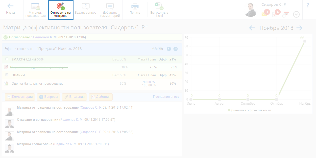 После заполнения данных в матрице эффективности она может быть отправлена на контроль для того, чтобы контролирующий мог проверить выполнение SMART-задач и ознакомиться информацией о достижении плановых значений показателей.