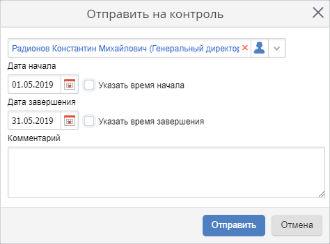 В появившемся диалоговом окне (рис. 2) по умолчанию в качестве контролера указывается пользователь, который был указан в шаблоне матрицы эффективности. В случае необходимости из выпадающего списка можно выбрать другого контролирующего сотрудника.