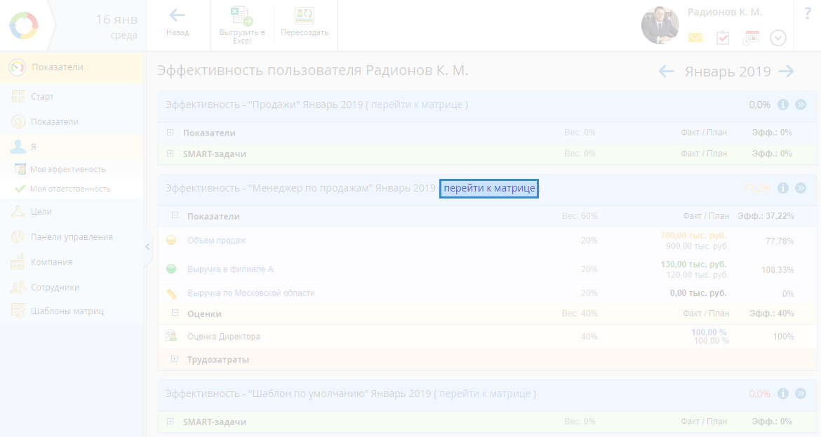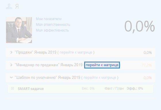 Рис. 1. Раздел "Показатели – Я – Моя эффективность". Ссылка "перейти к матрице"