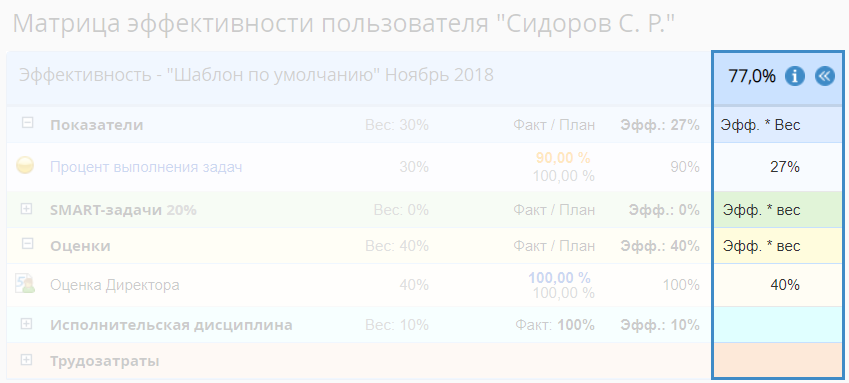 Рис. 8. Матрица эффективности пользователя. Группа "Исполнительская дисциплина". Кнопка "Пересчитать"