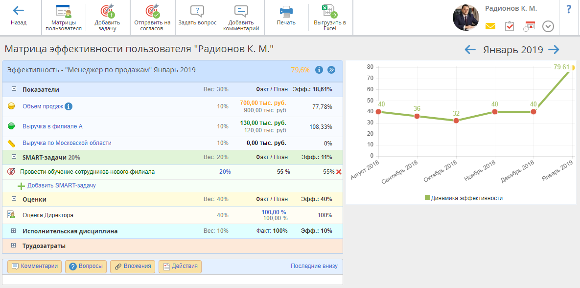 Эффективность – "<Название матрицы эффективности>" <период>), диаграммы, отображающей динамику эффективности пользователя, а также
