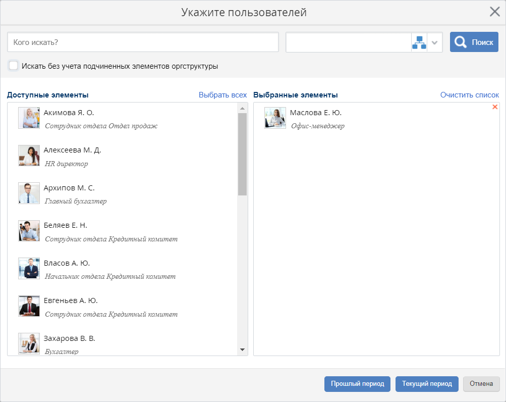 выбора пользователей (рис. 2), в котором необходимо выбрать требуемых пользователей для выгрузки их показателей или матриц эффективности.