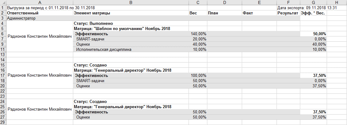 При выгрузке матриц эффективности сотрудников данные в сформированном файле также группируются по ответственным за них сотрудникам. В файл также записываются: