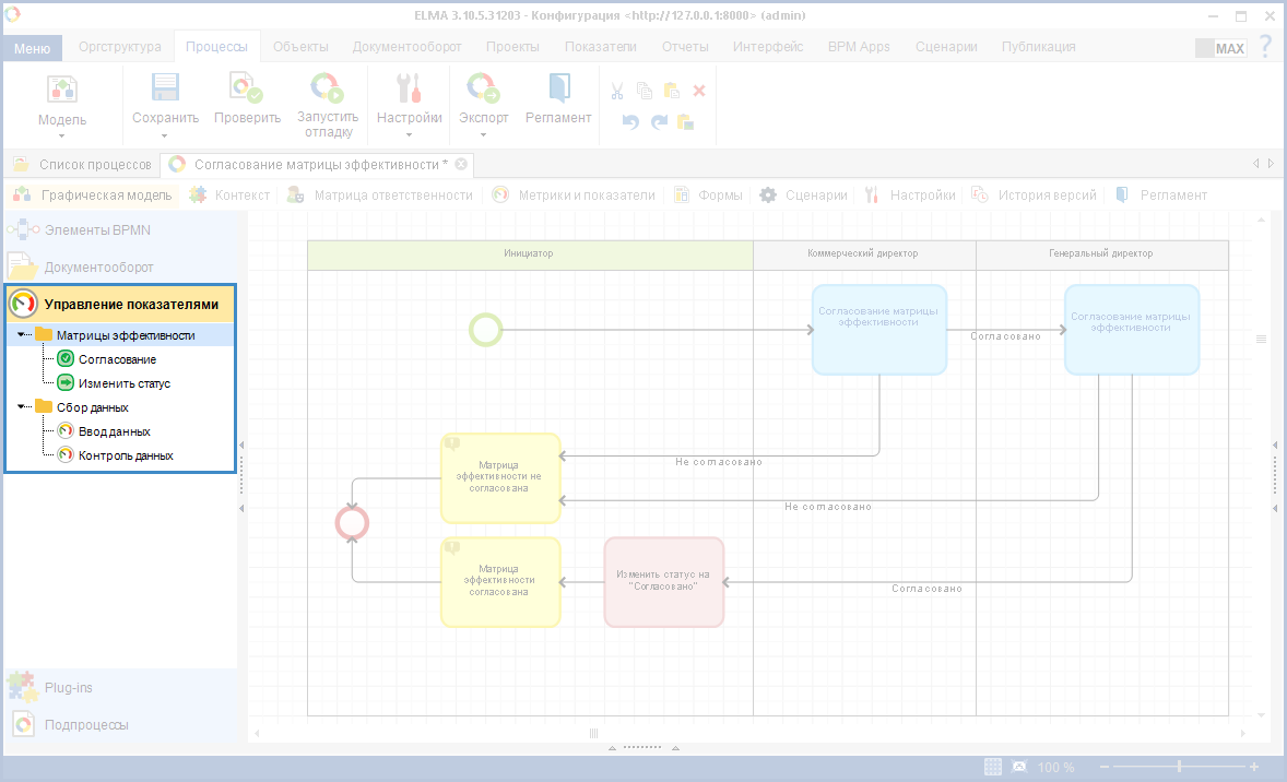 Операция Согласование доступна в том случае, если активировано приложение ELMA KPI. В веб-приложении данная операция создает задачу согласования матрицы эффективности. Данную операцию рекомендуется использовать в случае, когда необходимо организовать процесс согласования матрицы эффективности несколькими пользователями.
