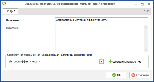 Контекстная переменная, указывающая на матрицу эффективности – в данном поле необходимо указать контекстную переменную типа "Матрица эффективности", в которой содержится требуемая матрица эффективности. Для создания новой переменной необходимо воспользоваться кнопкой Добавить переменную справа от поля.