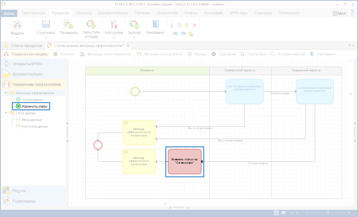 Операция Изменить статус располагается на вкладке Графическая модель в блоке Управление показателями в группе Матрицы эффективности (рис. 4). Операция может быть добавлена на графическую модель процесса также, как и другие операции.