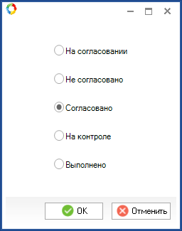 Статус матрицы эффективности – данный параметр определяет статус, который будет присвоен матрице эффективности после выполнения данной операции. Для изменения статуса требуется нажать на кнопку Изменить значение, в открывшемся окне (рис. 6) выбрать необходимый статус и нажать на кнопку OK.