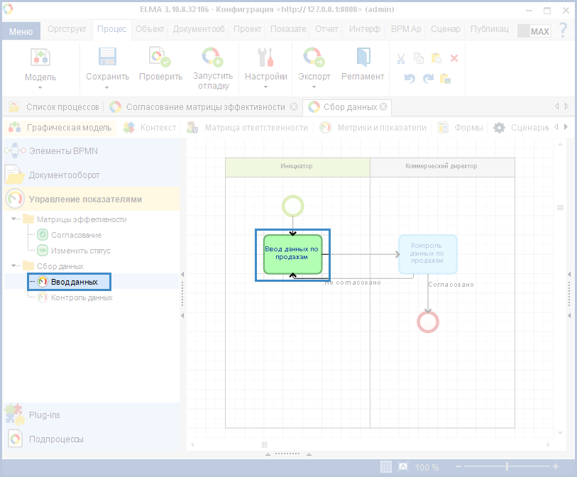Рис. 1. Вкладке процесса "Графическая модель". Блок операций "Управление показателями"