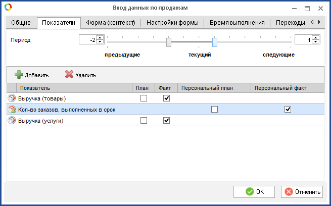 Рис. 9. Диалоговое окно настройки операции "Ввод данных". Вкладка "Показатели"