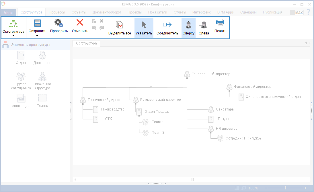 Кнопка Выделить все позволяет выделить все элементы, расположенные на листе моделирования оргструктуры.