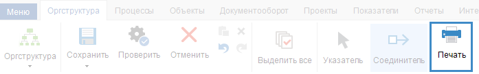 Для того, чтобы распечатать текущий лист моделирования оргструктуры, следует на панели инструментов на вкладке Оргструктура в Дизайнере ELMA нажать кнопку Печать (рис. 1).