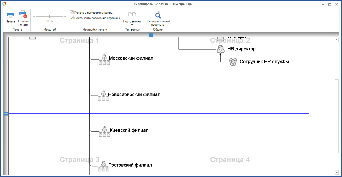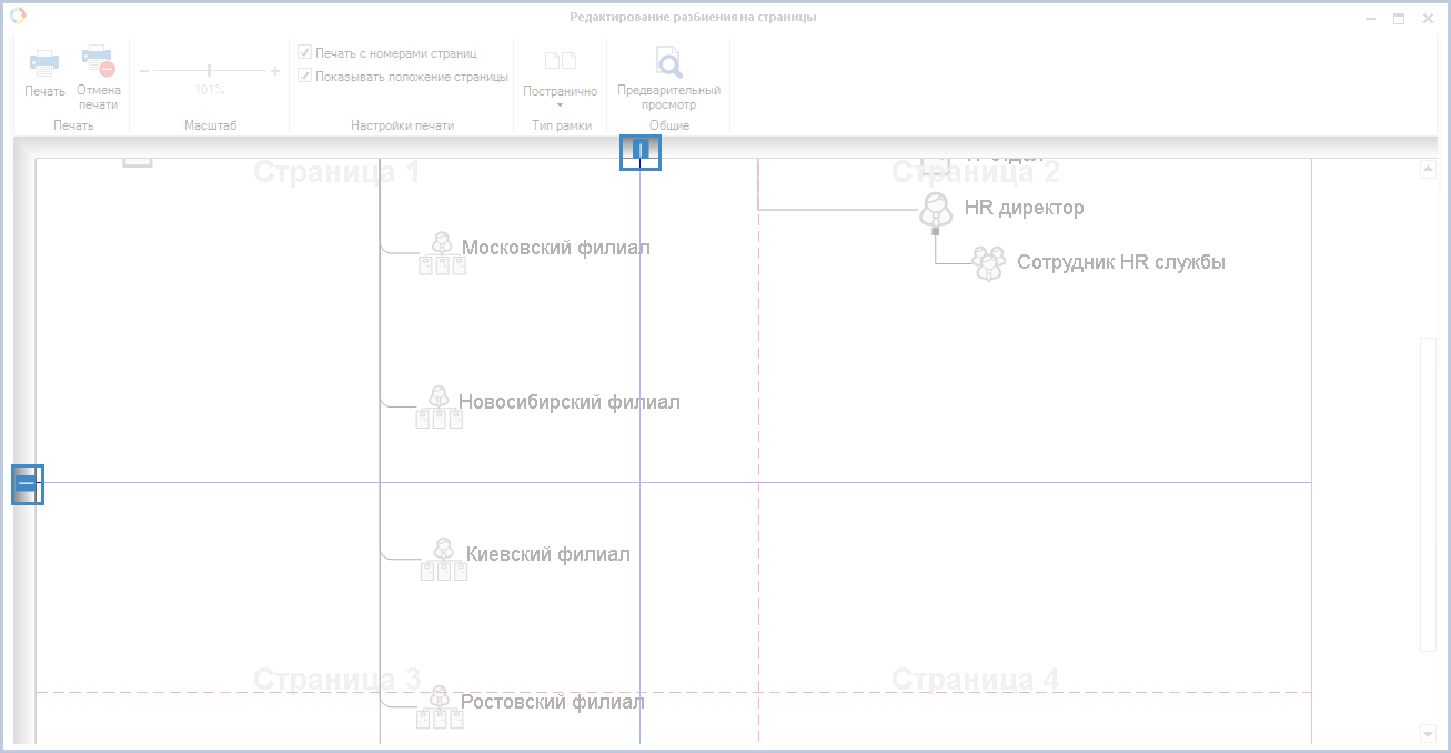 При необходимости модель оргструктуры может быть распечатана на нескольких листах. Для этого следует нажать кнопку Разбить документ на страницы, после чего в окне Редактирование разбиения на страницы необходимо распределить модель по нескольким листам (рис. 4).