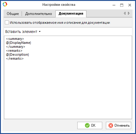 Для формирования документации по коду используется стандартный механизм документирующих комментариев. Синтаксис - http://msdn.microsoft.com/ru-ru/library/b2s063f7.aspx. Если установлен флажок Использовать отображаемое имя и описание для документации, то для генерации документации по типу объекта используется шаблон:
