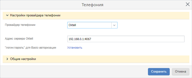"логин:пароль" для Basic-авторизации – необходимо ввести логин и пароль Basic-авторизации на сервере Oktell.