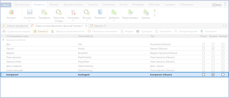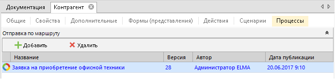 Рис. 3. Дизайнер ELMA. Вкладка "Процессы" карточки объекта