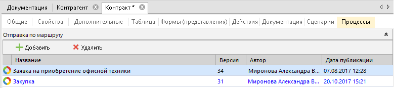 Следует отметить, что в карточке дочернего объекта на вкладке Процессы черным цветом будут отображены процессы родительского объекта, удалить которые можно только с карточки родительского объекта. При этом он будет удален и из дочернего объекта. Синим цветом отображаются процессы, добавленные с помощью кнопки Добавить (рис. 3).
