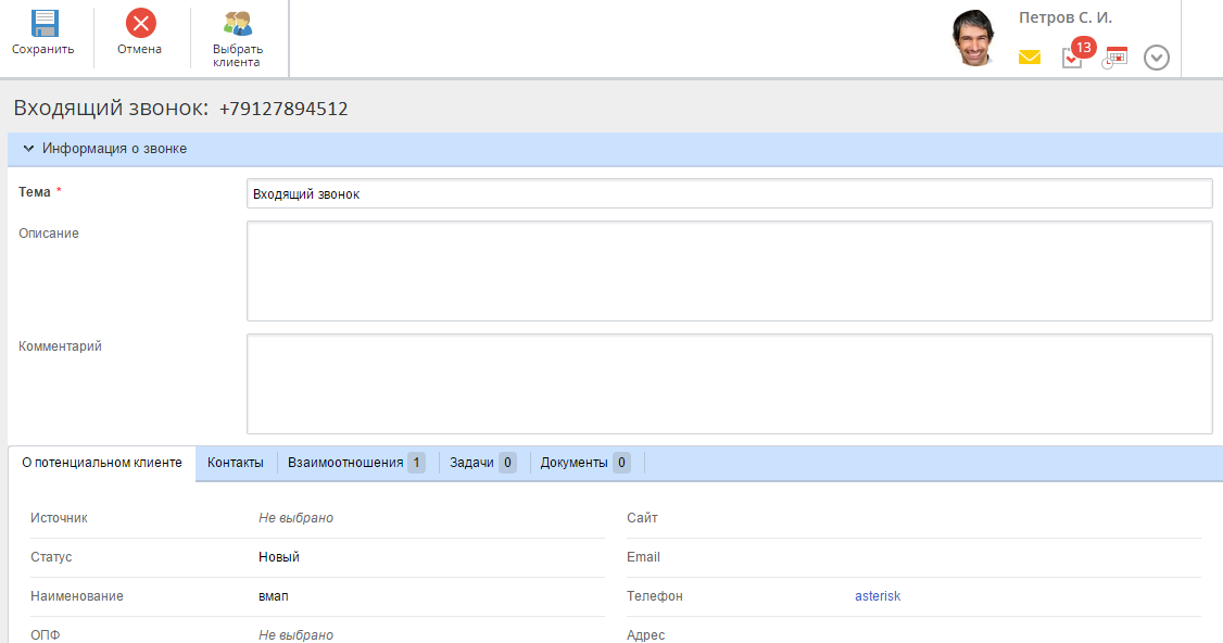 Рис. 1. Форма создания входящего звонка "Входящий звонок: <номер телефона>"