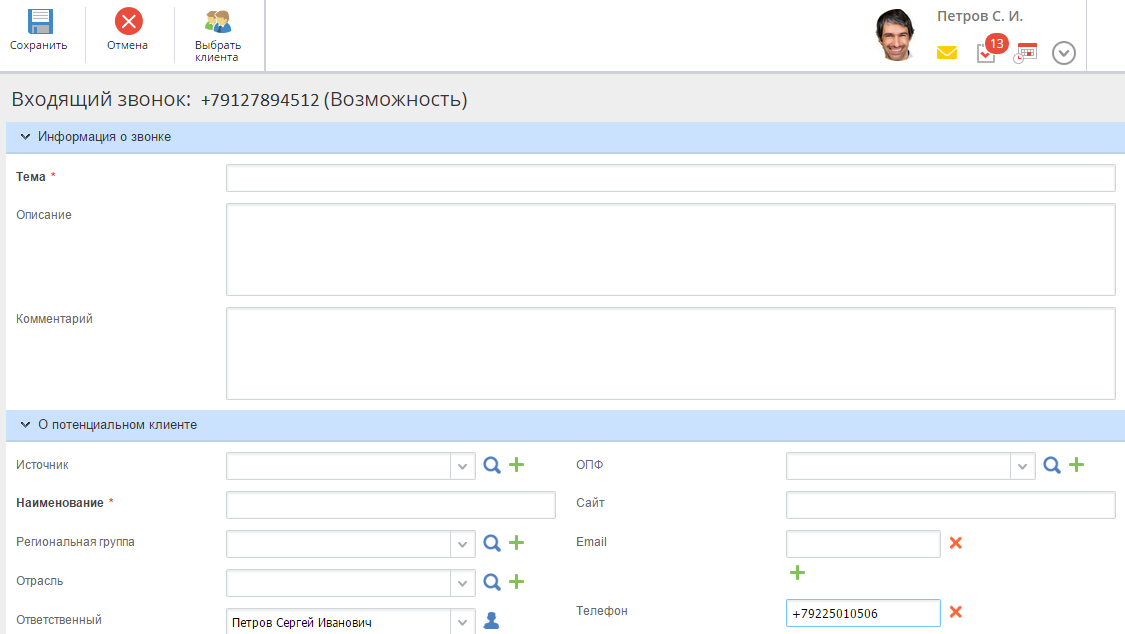 Данная форма состоит из двух блоков: Информация о звонке и О потенциальном клиенте.