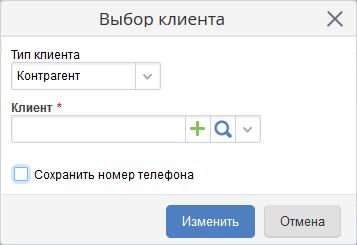 При нажатии на кнопку верхнего меню Выбрать клиента отобразится диалоговое окно Выбор клиента (рис. 3), в котором можно указать тип клиента и клиента из выпадающего списка. Для поиска необходимого клиента следует воспользоваться кнопкой , для создания нового клиента следует воспользоваться кнопкой . В том случае, если в карточку указанного клиента требуется сохранить номер телефона входящего вызова, необходимо установить флажок Сохранить номер телефона.