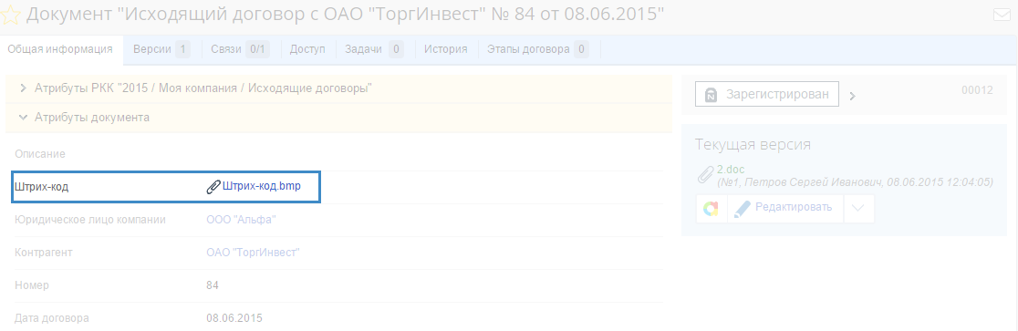 Штрих-код формируется при регистрации документа на основе регистрационного номера документа и отображается в карточке документа на вкладке Общая информация в разделе Атрибуты документа (рис. 2). Изображение штрих-кода хранится в файле формата.bmp и при необходимости может быть сохранено на локальный компьютер и распечатано.