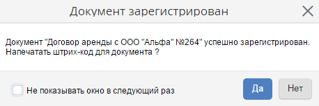 для печати штрих-кода необходимо нажать на кнопку Да, для отмены печати штрих-кода необходимо нажать на кнопку Нет. Для того, чтобы данное окно не отображалось при регистрации документа необходимо установить флаг в поле Не показывать окно в следующий раз.