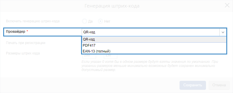 Провайдер – из впадающего списка следует выбрать необходимый формат штрих-кода – QR-код, PDF417, EAN-13(полный)(рис. 2).