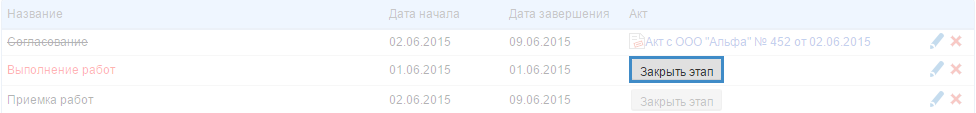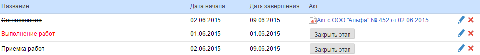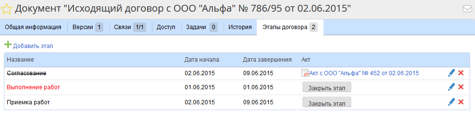 Название закрытых этапов договора отображается черным цветом и зачеркнуто.