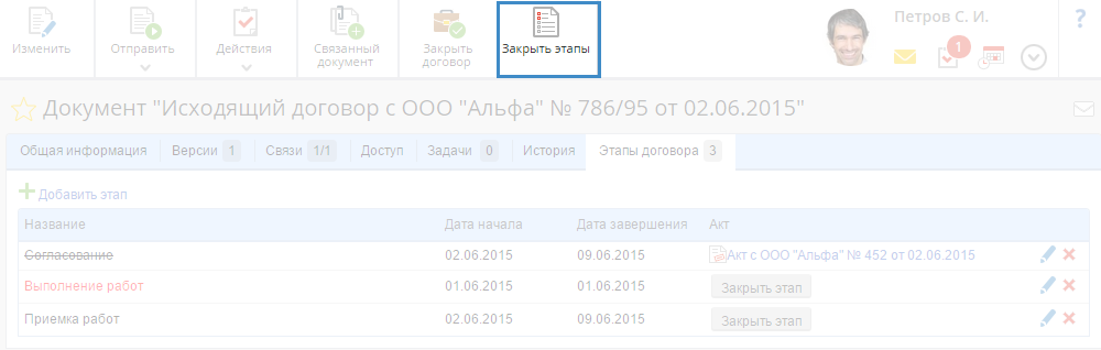 Рис. 8. Карточка договора. Вкладка "Этапы договора". Кнопка "Закрыть этап"