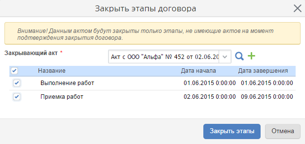 В открывшемся окне необходимо отметить флажками те этапы договора, которые необходимо закрыть и выбрать из выпадающего списка акт, подтверждающий закрытие этапов договора. Для поиска необходимого акта воспользуйтесь кнопкой