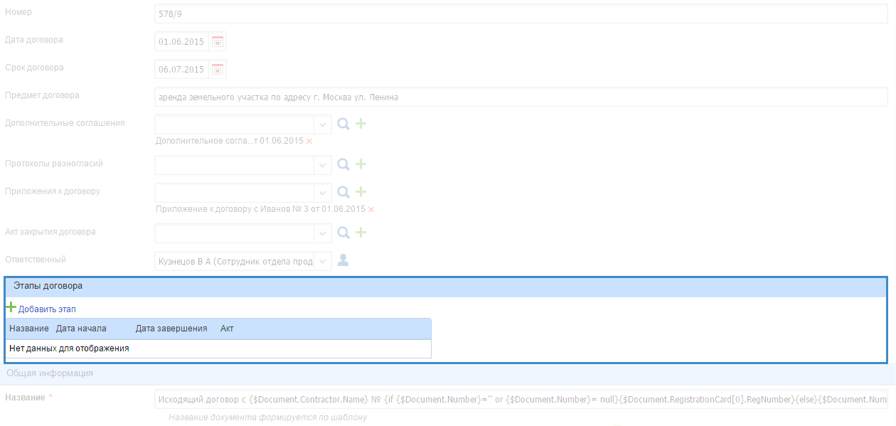 Рис. 1. Карточка договора. Вкладка "Этапы договора"