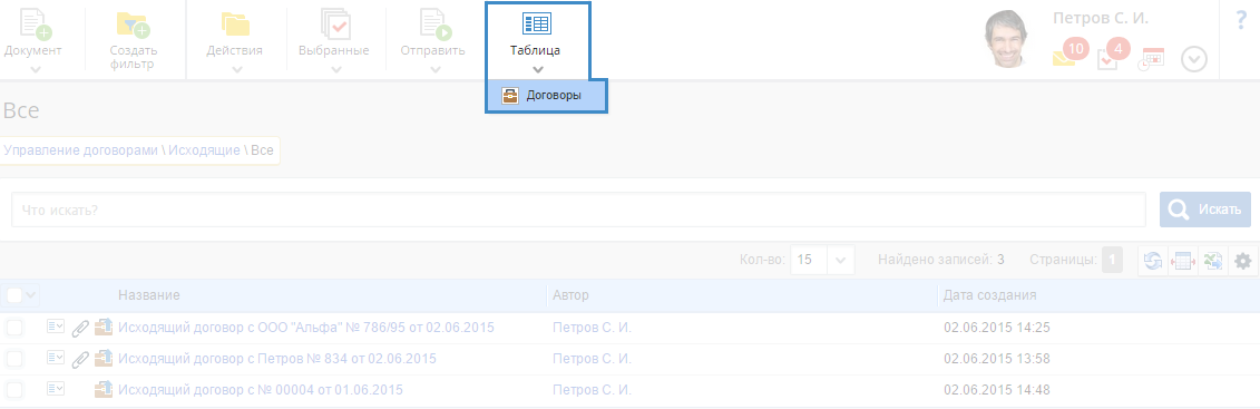 Для того, чтобы вернуться в стандартный режим отображения данных, необходимо в верхнем меню папки нажать на кнопку Таблица в расширении кнопки Договоры (рис. 4).