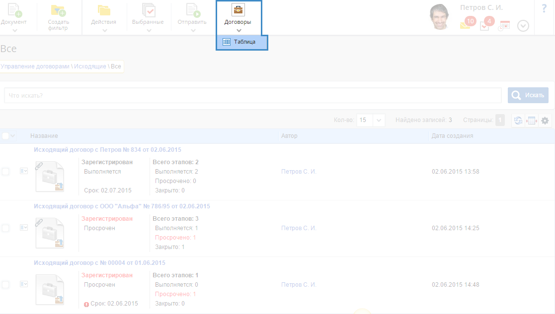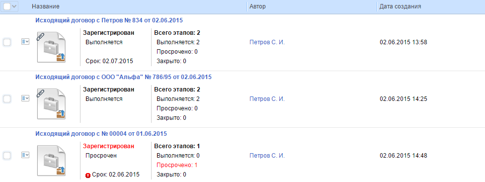 количество этапов документа и их статусы – Выполняется, Просрочен, Закрыт.