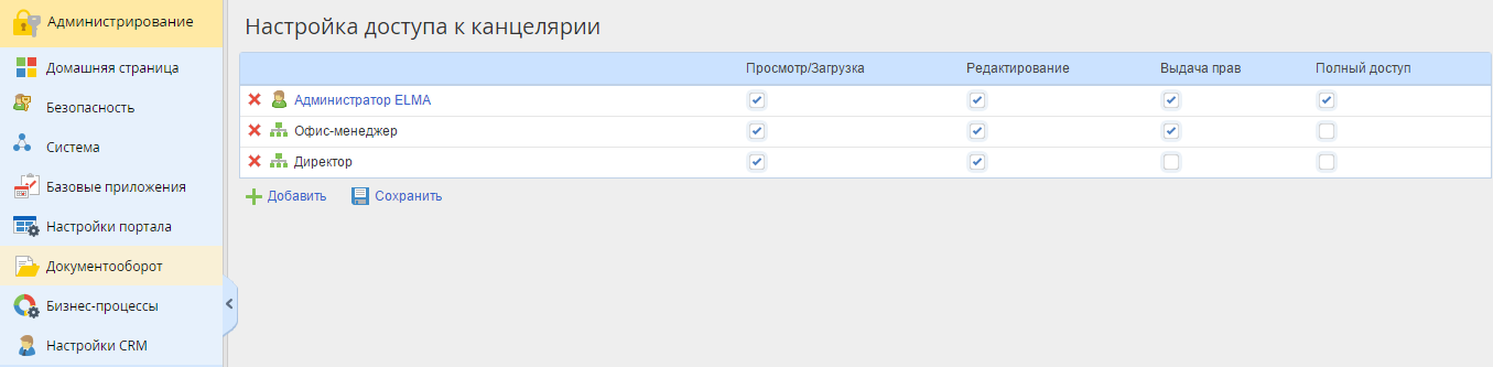 Для назначения прав доступа необходимо нажать на кнопку Добавить, расположенную ниже таблицы с уровнями прав доступа и в открывшемся окне выбрать требуемый объект для назначения прав доступа. Для выбранного объекта необходимо установить флажки на требуемые уровни прав доступа и нажать на кнопку Сохранить.