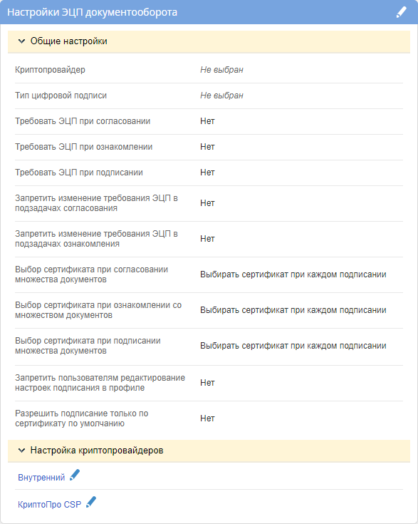 В данном блоке осуществляется настройка криптопровайдеров для подписания документов с использованием ЭП. По умолчанию в системе доступна настройка блоков криптопровайдеров: Внутренний и КриптоПро CSP. Стоит отметить, что настройки данных блоков различны.