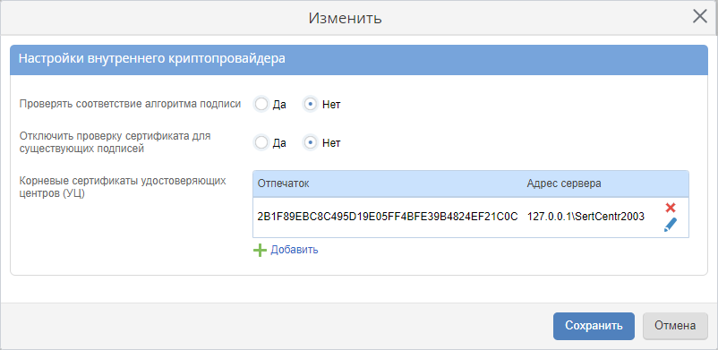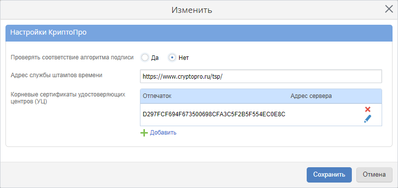 Для редактирования существующих отпечатков корневого сертификата необходимо нажать на кнопку , а для их удаления – .