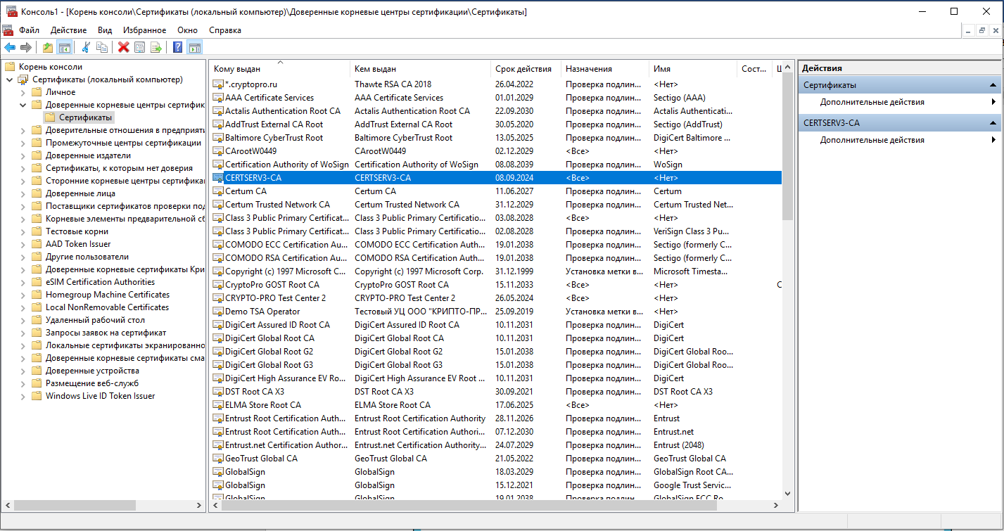 6.     В левой части окна перейдите в папку Доверенные корневые центры сертификации – Сертификаты. После чего откройте необходимый сертификат, нажав на его название.
