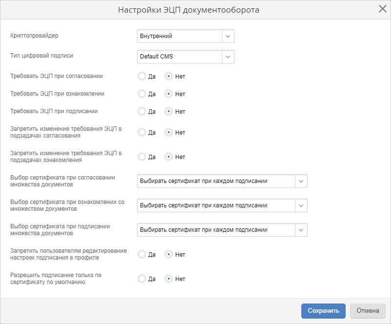 Криптопровайдер – возможность выбора из выпадающего списка криптопровайдера, по умолчанию установленного в профиле пользователя, который будет использоваться для подписания версий документов. При выборе внутреннего криптопровайдера необходимо предварительно настроить центр сертификации, а также получить пользовательские сертификаты.