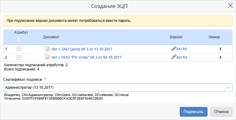 Возможность подписания версий документов в системе ELMA доступна только при наличии активированного приложения ECM+, а также при выполнении соответствующих настроек.