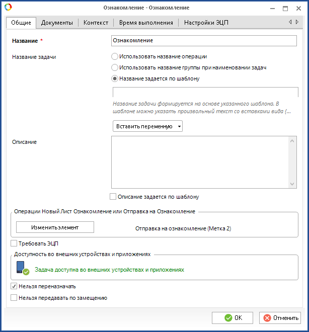 Общие. Данная вкладка, а также все настройки на ней аналогичны вкладке Общие операции Согласование. Отличие заключается в отсутствии настройки Согласование с помощью маршрута согласования.