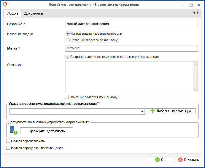 Данная операция формирует новый лист ознакомления документа. В веб-приложении эта операция не отображается. Данную операцию в графической модели процесса необходимо связать с помощью меткиили контекстной переменной типа Лист ознакомленияс операцией Ознакомление. При использовании данной операции список исполнителей должен быть определен в операции Ознакомление с помощью контекстной переменной или из пользователей зоны ответственности, в которой находится операция Ознакомление.