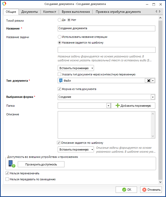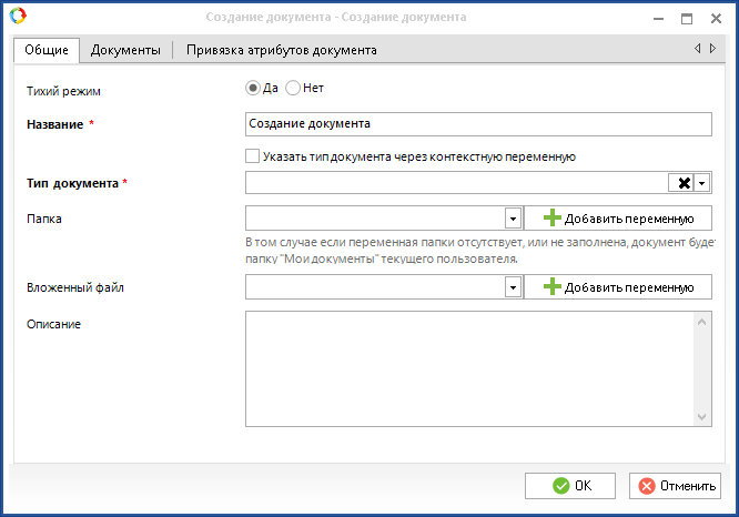 При настройке операции Создание документа доступна возможность использования Тихого режима (рис. 3). При установке переключателя в положение Да пользовательская задача создания документа создаваться не будет.