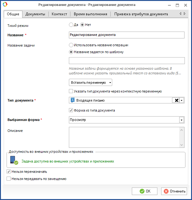 Отличия заключаются в том, что в настройках операции Редактирование документа нет возможности выбрать папку или добавить переменную с папкой, в которой содержится документ, а также задать описание задачи по шаблону.